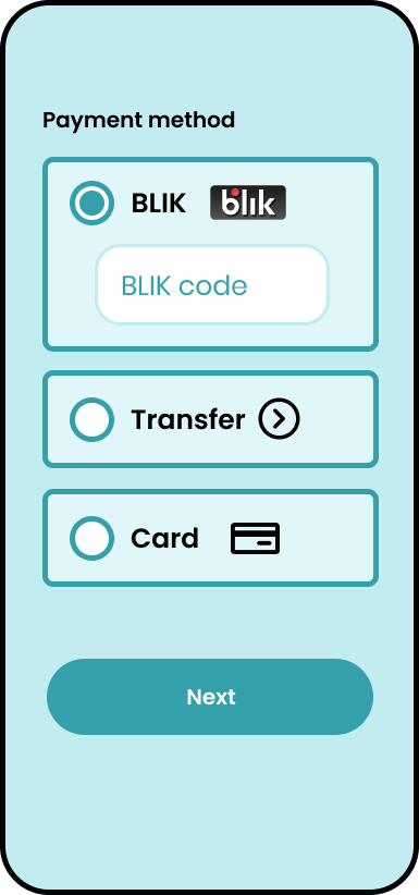 The field for entering the code should be in the same section of the service as the selection of a payment method (the user focusing his/her eyes on the selection of a payment method may not notice that input for entering the BLIK code has appeared in another section). Input for entering the BLIK codes should be visible, immediately identifiable as one where the should enter a BLIK code (and not, for example, a discount code) and not covered by any other system element. |